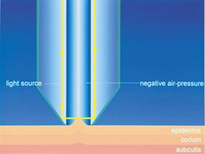 The Cutometer® has a suction based measurement method. Negative pressure is created by the pump in the device. The negative pressure draws the skin into the aperture of the probe. Inside the probe is a non contact optical measuring system, consisting of a light source projected across the aperture to a light receiver, measuring the distance into the aperture that the skin travels. The resistance of the skin to being sucked into the aperture is determined by the firmness of the skin while the ability of the skin to return to its previous position is the elasticity. The results are displayed in a curve from which a series of interesting parameters can be calculated. The parameters calculated include the R-parameters, the F-parameters and the new Q-parameters.
